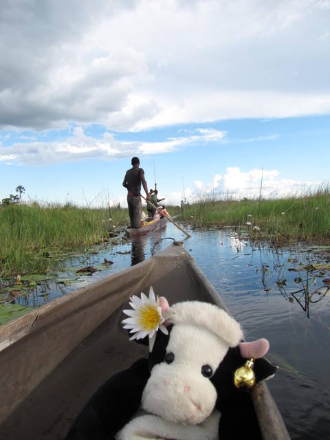 26 december. Om half zes staan we naast onze tent. De Okavango Delta wacht op ons. Om 7.00 uur staat een 20 persoons 4×4 vrachtwagentje voor. Spullen inladen en gaan met de banaan (en nog véél meer spullen). Ruim een uur gehobbeld dan zijn we bij ons tussenstation. Hier stappen we over op een Mokoro. Dit is een Afrikaanse kano, gesneden uit de Marala boom. De boot wordt doormiddel van een stok voortbewogen door onze poler, Kenny. Vanaf nu kunnen we de film Afrika 3D, die we in het Cinemac in Ede, een aantal maanden voor vertrek gezien hebben, echt gaan beleven. Het enige geluid wat we horen zijn de vogels, kikkers, het riet tegen de boot en soms een plons van de stok in het water. We zitten laag bij het water, riet wuift uiteen, watervogels schieten weg en we zien vele waterlelies. Sommige watergangetjes zijn niet veel breder dan de Mokoro. We arriveren op een eilandje midden in de Delta, ons kamp wordt gemaakt op een open plek in het bos. Faciliteiten behalve onze eigen tent hebben we niet. Het toilet is een gegraven gat van 75cm diep in de grond. Graag een beetje dichtscheppen na gebruik. De schep is daarbij ook nog het slot op de deur. (Eventuele detail vragen horen we wel). De middag vermaken we ons zelf met Mokora varen, we oefenen, maar het is best lastig. We varen naar onze zwemspot. Heerlijk helder water van 1,5 meter diep tussen riet en lelies. Aan het eind van de middag hebben we een wandeling door het gebied. We zien een giraf, zebra’s en vele vogels. Bij terugkomst diner en vroeg de luikjes dicht, 21.00 uur.
