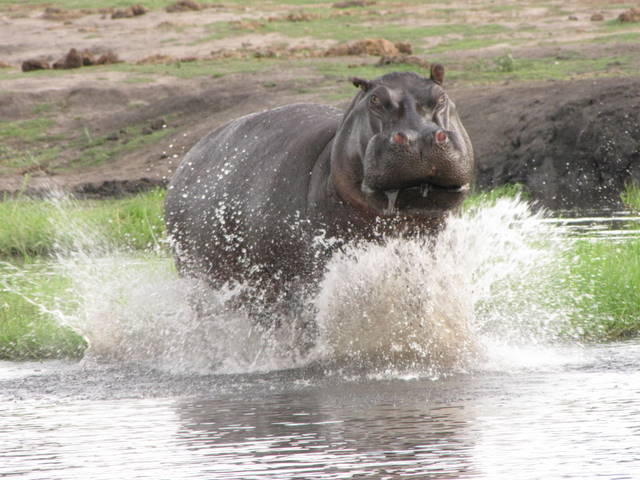 29 december. We staan om 6.30 uur op. Vandaag de reis naar Chobe national park. Weer een lange dag op de weg. Langs de provinciale weg (100km/u) zien we nog steeds heel veel Koen vriendjes (zwart, bruin, grijs) en ezels. Dat ze niet alleen voor Sonny laat oversteken zien we wel aan de exemplaren die af en toe levenloos langs de kant liggen. Verder is de route een beetje saai zodat de meeste mensen in slaap vallen. Totdat we ineens de ankers ingaan en een groep olifanten in de berm naast ons zien staan. Even laten staat er zelfs een olifant in de middenberm die we bijna kunnen aanraken. Toch is het erg tegenstrijdig, onze weg is aangelegd dwars door een natuurgebied. En er zijn werkzaamheden over 140! km. Rondom onze campsite staat een hoog hek met schrikdraad om ons te beschermen tegen de olifanten. Aan het eind van de middag hebben we een boottocht op de Chobe rivier. Op deze plek vormt de rivier het vierlandenpunt van Botswana, Zimbabwe, Namibië en Zambia. Wederom een gelukkige trip. We zien al snel krokodillen, nijlpaarden, een hagedis van een meter lang, en ontzettend veel vogels. De mooiste vonden wij de visarend. Het lukt ons om een prachtige foto te maken van een nijlpaard die het water in plonst. Op het einde van de trip zien we zelfs nog de buffel. We hebben nu de BIG 5 compleet!!.