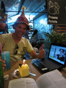 10 januari. Vandaag is een grote feestdag in Thailand. Vandaag wordt gevierd dat Erwin 29 jaar geleden op de wereld kwam. Of Thailand daar veel van zal merken is nog niet bekend, wij gaan het in ieder geval vieren. Om 0.00 uur plaatselijke tijd komen de eerste SMSjes uit Nederland, waar ze dan nog aan het avondeten zitten op 9 januari. Wij gaan slapen. Rond 8.00 uur staan we op en gaan we verder op ontdekkingsreis door Bangkok. We nemen een gemotoriseerde Tuktuk en spreken af voor 30 Bath de toeristische attracties te kunnen zien. Dit gaat de eerste drie tempels goed, daarna gaan we ook ongevraagde kledingwinkels zien. Aangezien een nieuw overhemd wel erg goedkoop is, besteld Erwin er eentje. Nu bestelt, vanavond om 21.00 uur bezorgt in het hostel. Even kijken wat de kwaliteit is voor het geval we er een trouwjurk willen kopen… In de middag brengen we nog een bezoek aan de tempels van het koninklijk paleis. Dit is absoluut de moeite waard met alle Boeddha’s en gouden tierelantijntjes. Verder proberen we wijs te worden hoe goed Thailand zelfstandig te bereizen is. Bijna iedere Thai probeert je tourtjes aan te smeren en er zijn meer nep toeristeninfo’s dan echte. De TAT moet de echte zijn en die proberen ons een tour aan te smeren van 50.000 Bath. (1300 euro) Ondanks dat we een studentenkorting krijgen van 11000 Bath, beslissen we om het lekker zelf uit te gaan zoeken. Later lezen we in onze tweedehands aangeschafte Lonely Planet van Thailand dat de enige echte TAT helemaal geen tourtjes verkoopt… Met een nieuwe Tuktuk driver (de oude vond wachten bij het paleis te veel moeite), gaan we terug naar de oude stad om eten te kopen en een restaurant te zoeken. We hebben namelijk nog wat te vieren. We gaan eten bij een restaurant met gratis draadloos internet, zodat we kunnen Skypen met het thuisfront en live muziek. Snel houden we nog een straatverkoper aan en met een beetje onderhandelen, koopt Erwin voor weinig geld een Thaise verjaardagsmuts. Het feest kan beginnen. Het feestmaal bestaat uit pasta met gefrituurde kip en Erwin besteld een Blue Hawaï cocktail met rum (twee voor de prijs van één, zegt de ober). Tijdens het eten Skypen we er lustig op los met Erwin zijn ouders en de zus van Rhianne. Wel jammer van de baggerslechte verbinding. Net als we de zus van Erwin, met neefje Sem, aan de lijn hebben wordt het, door Rhianne geregelde, verrassingsdessert gebracht. De muziekkant speelt voor Erwin Happy Birthday en de ober brengt een taartje mét kaarsje! Het feest is, met de tweede cocktail compleet. (zie foto voor alle details. Als we weggaan, blijkt pas de derde cocktail gratis te zijn. Dit mag de pret niet drukken. De take away cocktail gaat er ook nog prima in. Om 22.00 uur snel het overhemd halen, blijkt deze er niet te zijn. Zijn we weer Thais gepiepelt? Nee hoor om 23.15 wordt die als nog gebracht en hij past prima!