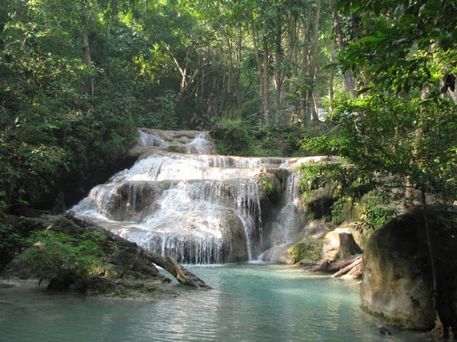 12 januari. Een vroegertje vandaag, om 06.30 de wekker om de bus te halen. We gaan naar de Erawan watervallen in Erawan National park. Aan de late kant lopen we weg bij het hostel. Aangezien de tijd zo dringt en we de bus willen halen nemen we halverwege een riksja (fiets met zitplaats er achter). Helaas onze driver is niet al te snel en bovendien lopen we vast in de spits. We gaan dus maar weer lopen. Net buiten het busstation kunnen we nog net in bus 8170 springen die al vertrokken was. Laat de bus nu dezelfde weg nemen zoals wij die gelopen hebben… pffff. Na anderhalf uur in een bus, die in Nederland al een paar jaar van de weg gehaald zou zijn, arriveren we in het park. De jungle omgeving met de zichtbare zonnestralen door de bomen is prachtig. Volgens de gegevens strekt de waterval zicht uit over zeven niveaus en een lengte van 1500 meter. Op elk niveau kan gezwommen worden in heerlijk koel blauw water. Wij beslissen eerst helemaal naar boven te gaan en dan te gaan zwemmen. Op weg naar boven zien we een mierenkolonie lopen in een sliert van één cm breed en wel tien meter lang. Alle niveaus zijn totaal verschillend van elkaar en de één is nog mooier dan de ander. Wat opvalt zijn de vele vissen in het water. Eenmaal boven gaan we gelijk zwemmen. Als Rhianne in bikini staat, wordt ze evenals vele andere vrouwen, door een aantal Japanners ongevraagd vastgelegd op foto en film. Blijkbaar komen ze daar wat tekort. Eenmaal in het water blijken de visjes, pedicurevisjes te zijn. Zodra we een voet in het water zetten beginnen de visjes aan onze voeten te sabbelen/bijten. Het is blijkbaar heel goed om dode huidcellen te verwijderen, maar een heel vervelend gevoel om te voelen. Op weg naar beneden beklimmen we nog verschillende watervallen en zwemmen we op een aantal niveaus. Vooral de glijbaan die uitgesleten is op een grote rots is erg leuk. Na ruim zes uur in het park gaan we terug naar Kanchanaburi. Na een bezoek aan de markt nog even bij schemer kijken bij de brug over de River Kway. De zonsondergang bij de brug is mooi en als het helemaal donker is wordt de brug, doormiddel van gekleurde led verlichting, uitgelicht. Mooi gedaan. Bij het diner ontmoeten we Janne uit het Finse Helsinki, wederom een leuk contact voor het adresboekje.