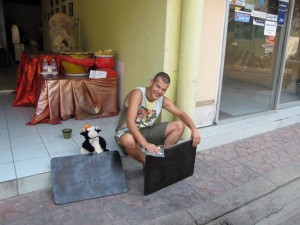 2 februari. Vandaag de laatste dag in Bangkok. We beginnen met een wasje, zoeken de foto’s uit, we werken de website bij en schuren en spuiten de platen voor achterop de fietsen. In de middag gaan we op Kao San road nog wat spullen kopen om de toilettas aan te vullen. We ruilen onze Lonely Planet van Bangkok in voor een Rough Guide van Cambodja en Vietnam. Helaas moeten we wel bijbetalen. Verder kopen we een goede kaart van Cambodja. We proberen Jackfruit uit, maar vinden het beide niet zo lekker. In de avond nemen we nog een massage. Rhianne vind deze lekkerder dan de eerste. Erwin wordt zo ongeveer gemangeld maar kan het eindresultaat wel waarderen. Koen vind dat hij wel een pedicure behandeling verdient heeft en Nou is zo vriendelijk hem deze te geven.