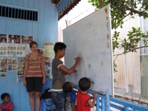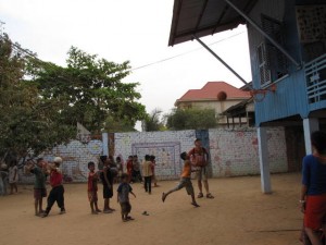 Onze aandacht gaat dan volledig naar de kinderen. We oefenen met basketballen, ze zingen een liedje voor ons en we doen pictionary met ze. Hiervoor tekent iemand iets op het bord en de andere zeggen in het Engels wat dit is. Het valt ons op dat de kinderen ontzettend graag les willen krijgen en dat ze best gedisciplineerd zijn. Als onze les verstoord wordt door Ron, een populaire vrijwilliger die onverwachts terug komt op het project, blijkt dit zeker. Alle kinderen rennen naar hem toe voor een begroeting, maar komen naar een paar minuten netjes terug en we kunnen verder. De tijd vliegt voorbij en pas als het donker is fietsen we, uitgezwaaid door alle kinderen, weg. Het avondeten doen we weer in het verlengde van pubstreet bij een van de vele stalletjes. Na het eten halen we, wederom bij een straatstalletje, voor anderhalve dollar drie Franse stokbroodjes. Bij Mommy (nog steeds ons questhouse), skypen we nog wat met het thuisfront, gaan we op mierenjacht en werken de administratie en verslagen bij.