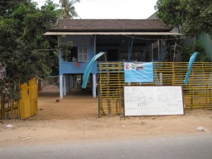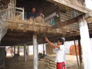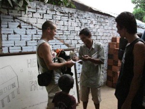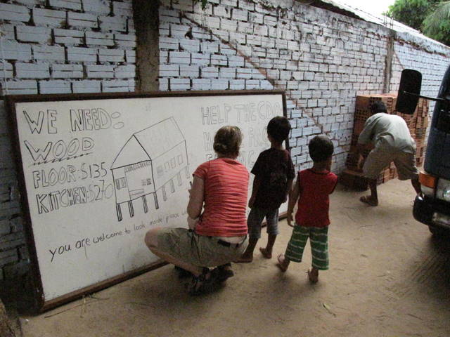 Dus zo gaan we op naar de ‘bouwmarkt’. De eerste in het dorp was wat te duur, dus met de tuk-tuk naar de grote markt. Stenen, zand, ijzer, cement, alles wat we nodig hebben is direct leverbaar. Niet nodig maar wel leuk om te benoemen was het breekijzer van betonijzer wat we zagen staan in de winkel. Terwijl het wensenlijstje wordt afgelopen, zijn een paar honden voor de winkel op niet verstane wijze de liefde aan het bedrijven. Uiteindelijk bestellen we om half drie en gaan terug naar het CDO huis. Terwijl we wachten maken we een bord voor buiten het hek. We tekenen hierop een oproep voor donaties om het huis leefbaar te maken. Het blijkt namelijk dat behalve hout voor de keuken ook dringend hout nodig is om sommige balken onder de vloer te vervangen.
