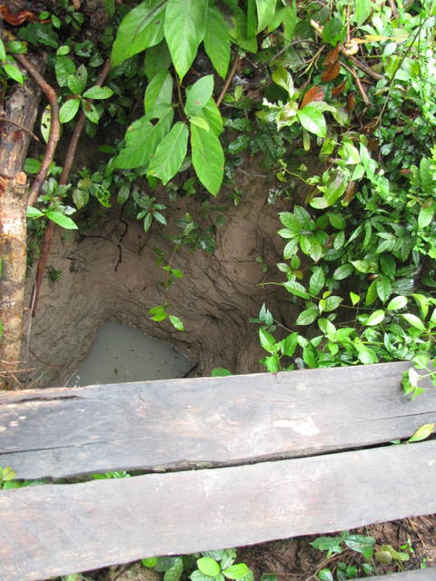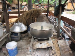 We komen bij een bijna lege waterput, de enige drinkvoorziening, een filter is er niet. We wandelen langs de ovens waarmee houtskool gemaakt wordt. Deze wordt verkocht op de markt in Siem Reap voor 4 dollar per zak. Oja het duurt twee weken voor een oven met houtskool klaar is… Een van de families heeft een kleine groentetuin, als we daar doorheen lopen beginnen Mom en Sakoun direct te eten. Wij krijgen ook allebei een mini komkommer. Als we er nog vier krijgen zeggen we met wat moeite dat we deze en ons brood wat we niet gegeten hebben willen weggeven aan kinderen in het dorp. Dit wordt maar apart gevonden. Ook werken de mensen in het dorp niet samen om beter te worden, dat zit niet in de cultuur. Dat betekend dus dat sommige families in het dorp veel eten hebben en anderen niks. Rond half twee beginnen we aan de anderhalf uur durende terugweg. Glibberen, glijden, waterplas, hobbels, kuilen, afijn we hoeven niets meer te zeggen…