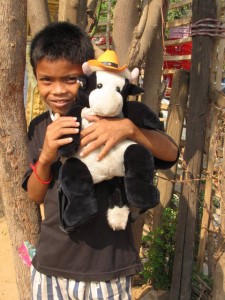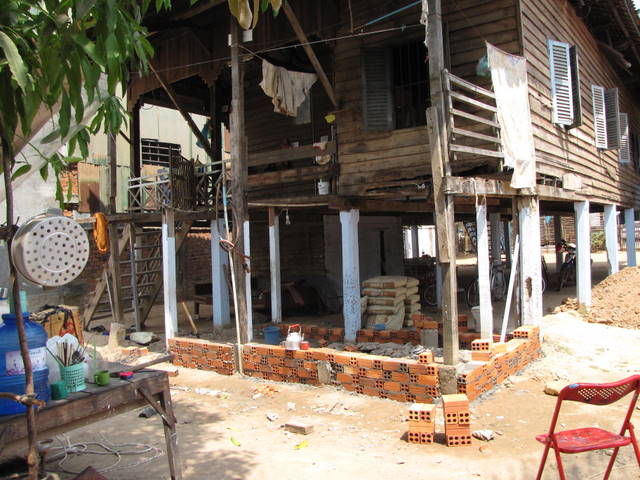 9 maart. We proberen uit te slapen, maar om 7.15 haalt iemand het in zijn hoofd om onze nachtrust te verstoren door muziek aan te zetten. Bij de eigenaar van ons questhouse regelen we de tickets voor de boot naar Battambang, Dan gaan we bij een fotowinkel de foto’s uitprinten van de ouders om deze aan de kinderen te geven bij het CDO huis. Dan gaan we nog even bij het project kijken. We geven de foto’s en de kinderen, zijn er heel blij mee. Ze vertellen ons trots dat dat hun ouders zijn. We blijven nog even hangen om met mensen die er zijn, Agatha en een koppel uit Spanje praten. Het stel komt kleding brengen en we gaan samen op de foto. De keukenvloer is al een eind op weg. De eerste stenen van de muur worden gemetseld.