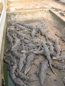 Des te leuker is het als de Amerikaanse familie terugkomt. Ze willen inderdaad het hout kopen en het wordt direct besteld. Joepie, ons werk kan afgemaakt worden! Halverwege de middag fietsen we nog even langs de krokodillenfarm. We willen graag zien hoe het er daar aan toe gaat. De vrouw bij de toegangspoort verteld ons dat er eieren, kleine en grote krokodillen te zien zijn. Als we binnen zijn blijkt het allemaal net even anders. Geen eieren en hele kleine krokodillen. Alleen maar opgepropte krokodillen, waarvan er veel slecht uit zien. Teleurgesteld omdat we hier drie dollar voor betaald hebben gaan we weer weg.