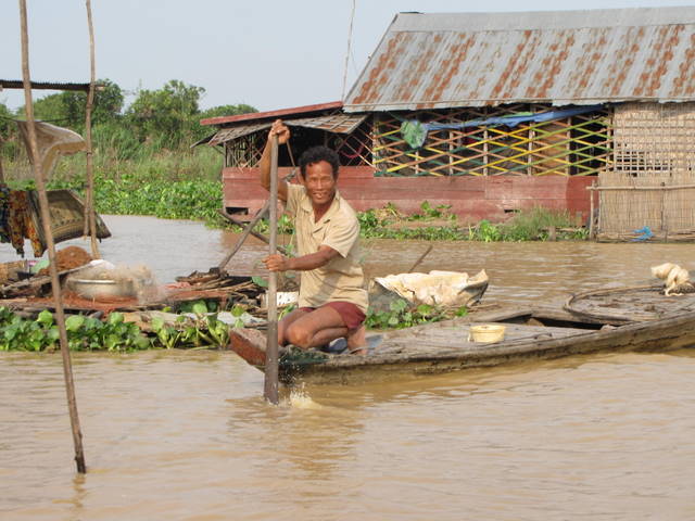 10 maart. Om 6.15 uur staat de pick-up truck voor, om ons naar de opstapplaats van de bus te brengen. We halen de planken van de fietsen en de fietsen worden netjes in het gangpad van de bus geparkeerd. Als we met de bus Siem Reap uitgaan, bekruipt ons weer een vreemd gevoel, als we ons realiseren dat het bijna vijf weken geleden is dat we voor het eerst de stad in kwamen. Wat is er ontzettend veel gebeurd in de tussentijd. Over een hobbelige gravelweg rijdt de bus naar de aanleg plaats van de boot. De bagage, inclusief de fietsen, worden op het bovendek neergelegd en we nemen plaats op de houten bankjes op het onderdek. Pas om 8.00 uur, een uur later dan de bedoeling was, vertrekken we. De motor maakt veel herrie, dus heel rustig zal het tochtje niet worden. Dat kan de pret niet drukken en we genieten van de drijvende dorpen. Werkelijk alles gebeurt hier op het water. Naar de kapper, naar school en naar de smid. Midden op het Tonle Sap meer stoppen we om planten uit de motor te halen. Door de lage waterstand is de verwachting dat dit vaker zal moeten gebeuren. Gelukkig het valt mee, we stoppen nog een keer om de schroef los te halen en een keer om planten te verwijderen. Als we bij de vierde keer stoppen gaat de motor uit. Wat nu, gewoon even “tanken”. Meegenomen jerrycan open, even gieten en we kunnen weer verder. Onderweg stappen locals vanuit kleine roeiboten behendig in onze boot om mee te liften naar Batambang. Zelfs met een mobiele telefoon is dit geen probleem, wel een grote tegenstelling met de simpele huisjes van het drijvende dorp. Met de hygiëne is het bijzonder matig gesteld. Aan de ene kant van de hut zitten varkens in hokjes met hun voeten in het water aan de andere kant poetsen mensen hun tanden en doen de was. We houden een pitstop in een drijvende winkel. Het toilet bestaat, hoe kan het ook anders, uit een hokje met een gat boven de rivier. Na de stop wordt de waterweg smaller en ondieper. De motor brult hard en zwoegt ons met moeite door het lage water. Na negen uur varen komt de brug van Battambang in zicht. Veel tuk-tuk drivers wachten ons op als de boot arriveert. Wij hebben de fietsen en zoeken zelf een plekje. Vannacht slapen we in (een) Lux(e) guesthouse. De slaapplek is wat duurder (8 dollar) maar we hebben warm water en een koelkast. We eten zeer smakelijk in een restaurantje genaamd Smokin’pot.