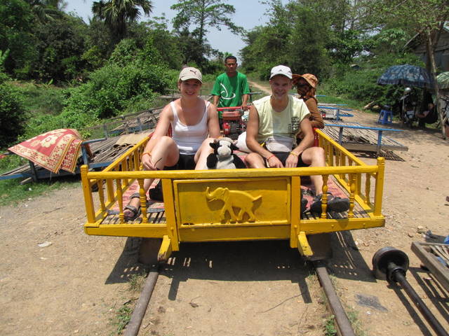 11 maart. Vandaag gaan we Batambang en directe omgeving verkennen. Het stadje is gebouwd langs de Sangker rivier. De drie hoofdstraten lopen parallel aan het water en worden onderling verbonden met vele zijstraatjes. Aangezien er hierdoor veel onoverzichtelijke kruisingen zijn en de locals ook nog eens een handje hebben van rijden tegen het verkeer in, is het goed oppassen hier op de weg. Door het vele water wat in deze provincie beschikbaar is, is het hier een stuk groener en wordt er veel landbouw bedreven. We beslissen rond het middaguur om een ritje te gaan maken met een bamboetrein, vijf kilometer buiten Batambang. We steken de rivier over via een van de bruggen. Verderop zien we op een brug drie monniken lopen in hun prachtige gele gewaad. Helaas zijn we net te laat om een foto te maken. Een volgende keer dan maar. De bamboetreinen zijn hele eenvoudige, door de lokale bevolking gemaakte, treinen. Ze bestaan uit een platform van bamboe en twee setjes kleine treinwielen met een as, waarvan een set wordt aangedreven door een simpele brommermotor. Wanneer we komen wordt onze trein “geprepareerd”: de wielen gaan op de rails, het bamboeplatform wordt er bovenop gelegd en de motor wordt geplaatst. Onze machinist heeft zich duidelijk uit geleefd op onze trein. Wij hebben in tegenstelling tot de meeste andere treintjes een mooie houten opstaande geel/rode rand en comfortabele kussentjes. Na het afrekenen van 10 dollar vertrekken we.