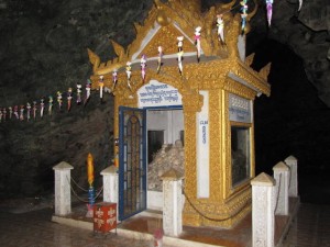 12 maart. Vandaag gaan we met de fiets de verdere omgeving van Battambang verkennen. Het vertrek is rond de klok van acht uur aangezien het dan nog lekker koel is. De Killing Caves zijn onze eerste bestemming. Hiervoor volgen we voor 16 km de nationale route 57 richting Pailin. We zien een aantal eenden fokkerijen. De eenden zijn omsloten door lage hekjes en kunnen niet meer vliegen. Als we arriveren, wimpelen we de fietsparkeerplaats af. We zouden moeten betalen om de fiets mee naar de top te nemen, mooi niet, aangezien niemand dit betaald. Het scheelt toch weer 1000 Riel per persoon. De grotten liggen op de heuvel Phnom Sampeau (Zeilboot berg). We willen met de fiets de heuvel op, dit is veel te stijl volgens de aanwezige Cambodjanen. We doen het toch maar en komen aan bij de grotten. We worden rondgeleid door een jongetje van 10 jaar oud. Hij vertelt een stuk uit de zwartste geschiedenis van Cambodja. Tijdens het drie jarige bewind van de Khmer Rouge onder leiding van Pol Pot werd een ware massaslachting onder de bevolking uitgevoerd. Onder andere op deze heuvel werden tegenstanders vermoord. Hun lijken werden vervolgens in de grotten gegooid. Er zijn twee grotten, één waar de kinderen in gegooid werden en de andere waar de volwassenen in gegooid werden. We dalen af in de donkere “kinderkelder”. Ondanks dat er weinig meer te zien is, is het indrukwekkend en luguber. In de grot van de volwassenen staan nog monumenten met schedels en kleding van de slachtoffers.