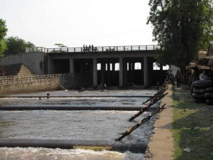 We fietsen verder naar de top van de heuvel en delen onze ervaringen. Even de tijd nemen om bij te komen. Na een bezoek aan de gerestaureerde tempels op de top, sjezen we naar beneden en vervolgen onze route naar de dam bij het meer van Kamping Poy. Hiervoor volgen we nog twee kilometer de nationale route 57 en slaan dan rechtsaf de weg richting het meer in. Deze fietsen we vervolgens voor 16 kilometer. Tussen de rijstvelden zien we vele eenden zwemmen voor de fok. Het verwondert ons dan ook niet als een koppel van meer dan 300 eenden ineens de weg oversteken, wel dat we niet met een bordje gewaarschuwd worden voor overstekende eenden. Aan het einde van de weg kunnen we de dam in eerste instantie niet vinden. We beslissen dan ook om in een open hut te genieten van het uitzicht over het meer en een poosje te wachten tot het minder warm wordt. We genieten op een mat van verse kokosmelk, uiteraard rechtstreeks vanuit de kokosnoot. Erwin gaat relaxen in een hangmat en Rhianne verwent hem nog extra door de heerlijk verse watermeloen die we onderweg gekocht hebben te serveren. Ook schrijven we onze kaarten. Na de siësta vinden we de dam, die het startpunt is van de irrigatie kanalen. De dam is gemaakt door gevangenen van de Khmer Rouge. Duizenden mensen kwamen hierbij om het leven. In het water achter de dam, loopt het water trapsgewijs naar beneden. Liggend in binnenbanden van een vrachtwagen spelen vermaken vele kinderen zich.