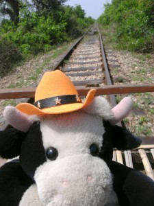 Het traject gaat over een lengte van 6 kilometer over oud, hobbelig spoor. Kromme rails met deuken zien we meer dan rechte rails. Wat zijn we blij met ons kussentje want we hobbelen wat af. Aan het einde van de track worden we bijna gesmeekt om een drankje te nemen. We beslissen om eerst de steenfabriek te bezoeken. Op hele ouderwetse manier worden hier nog met de hand bakstenen gemaakt. Als we terug zijn nemen we uit medelijden een blikje drinken. Alle geïmporteerde Coca Cola, Fanta en 7-up blikjes zijn minimaal 6 maanden over datum. We nemen een lokaal blikje drinken Longan en het smaakt best aangenaam. Als we terug gaan is onze “luxe” trein verruild voor een simpel exemplaar. Zittend op alleen een mat hobbelen we terug naar het begin station.