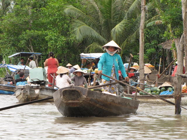 24 maart. Om 5.00 uur het bedje uit. We willen naar de Floating market bij Phong Dien De route lijkt niet moeilijk maar door werkzaamheden missen we een belangrijke afslag. Gevolg 12 km omgefietst. In het dorp is de markt niet te vinden. Eén van de weinig personen die vier woorden Engels begrijpt, na opschrijven, helpt ons verder. We gaan met een vrouw mee een boot in. We bespreken de boot voor een uur voor 100.000 dong. De markt is klein. Op ongeveer 15 boten wordt waar zoals groente en fruit verkocht en geruild. We gaan er zachtjes over het kanaal. Dan nemen we een afslag door een smalle zijrivier naar haar huis. We krijgen jackfruit, watermeloen en ze laat haar familie en huis zien. Best grappig om te zien en totaal onverwacht. Ze brengt ons terug bij de fietsen en als we willen afrekenen wil ze 200.000 Dong hebben aangezien we twee waren weg geweest. Omdat het niet de afspraak was, betalen we dit niet Het is een bekende handswijze in Vietnam. Gastvrij zijn, maar er wel voor betaald willen worden. Terug in de stad doen we boodschappen en houden in het hotel siësta. Aan het eind van de middag gaan we ons met Jenny en Enrico verdiepen in China, de bestemming na Vietnam.
