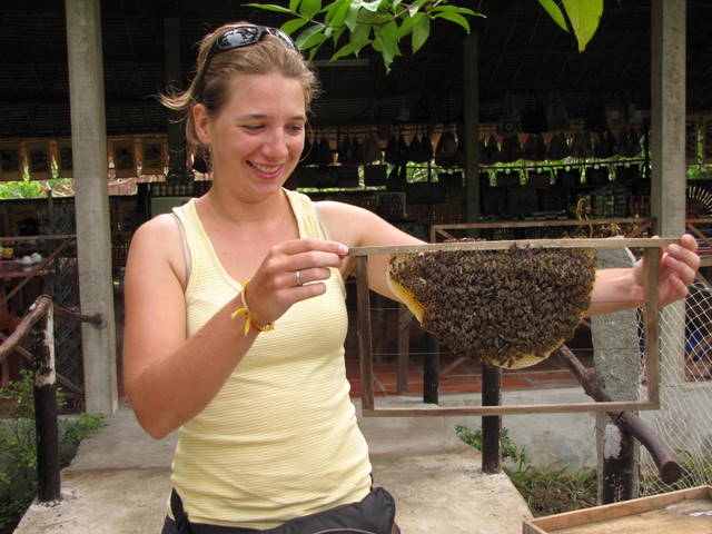 23 maart. Omdat het landschap niet erg interessant is en om tijd te winnen gaan we met de bus naar Can Tho. We hebben geen directe verbinding en moeten een keer overstappen. De fietsen en backpacks gaan op het dak van de bus. We zien weer muziekclips op flatscreen in de bus en de chauffeur toetert dat het zijn lust en leven is. De overijverige conductrice helpt mensen soms wel heel hardhandig de bus in en uit. Tijdens een stop komen er minimaal 10 verkopers de kleine bus in. Ze verkopen, drinken, eten, maar ook sieraden en sigaretten. En meerdere verkopen het zelfde. Het verslag bijwerken in de bus is al hobbelend en slingerend een hele uitdaging. Op het busstation, waar we moeten overstappen, weten we niet waar we heen moeten. Een tiental behulpzame Vietnamezen, die allemaal een andere kant op wijzen, proberen ons ergens naar toe te wijzen, maar het blijft allemaal erg vaag. Uiteindelijk vinden we een busmaatschappij die ons kan brengen. Helaas de fietsen passen niet erg goed, maar met wat propwerk kan het bagageluik dicht. Het eerste deel van de trip gaat prima, we kletsen wat mat een toerist uit Hawai en lezen wat. Na een stop wordt de weg slecht, de vele bruggen in de Delta zorgen ervoor dat de bus soms veranderd in een achtbaan. We maken kennis met Jenny en Enrico uit Duitsland en al kletsend arriveren we in Can Tho. Aangekomen blijken de fietsen er wonderwel goed van afgekomen te zijn. Even alles weer monteren en een hostel zoeken. ‘s Avonds gaan we uiteten met Jenny en Enrico.