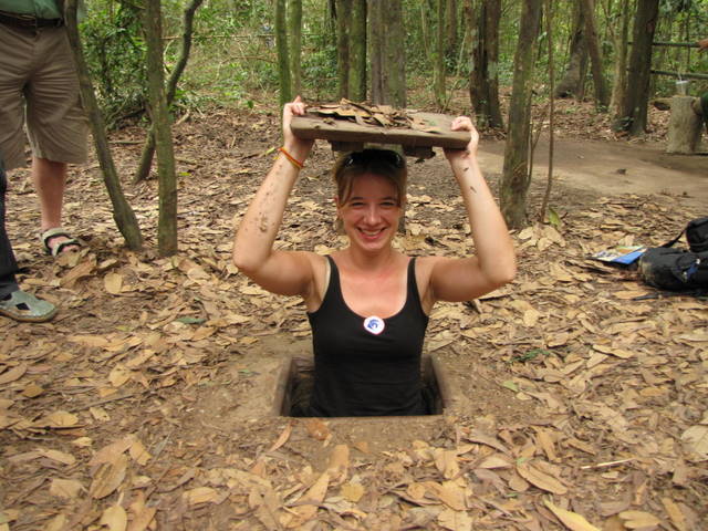 Na een aantal zeer vlugge foto’s, aangezien onze gids alweer doorgaat, gaan we naar een valkuil met flinke pinnen onderin. We zien beluchtingsheuvels en krijgen uitleg over waterafvoer. Ter voorkoming dat de tunnels door de Amerikanen onderwater gezet konden worden, bestaat het stelsel uit drie lagen waarbij de onderste laag uitkomt in de Saigon rivier. Zo werden de bewoners nat maar verdronken niet. De hut waarin gedemonstreerd wordt hoe wapens gemaakt werden en oude bommen gerecycled was interessant. Daarna kon nog geschoten worden met oude geweren uit de oorlog. We kruipen 100 meter door de tunnels wat, ondanks dat ze enigszins vergroot zijn en voorzien van verlichting, nog steeds erg beklemmend en warm is. We hadden kunnen zien hoe slippers van rubber gemaakt werden, maar onze gids staat in een hoge versnelling en slaat dit deel over. We doen enkel nog een kopje thee en eten een aardappel, voedsel wat de bewoners van de tunnels regelmatig aten. Eenmaal terug in de stad maken we een kleine rondwandeling. Het meest opvallend was de straat met opticiens, waar voor vijftien euro, een nieuwe bril binnen een halfuurtje gemaakt wordt. Ook heeft Koen sjans met een winkeljuffrouw. In de avond Skypen we met beide ouders te gelijk. Live worden onze pakketjes uitgepakt uit Zuid Afrika en Thailand.