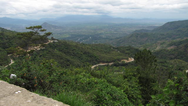 30 maart. Er staat een fietsdag naar de kustplaats Phan Rang. De afstand is ongeveer 110 kilometer. Toch denken we dat deze goed past in ons idee van leuke fietsroutes aangezien bijna de helft van de route omlaag gaat. Dus ons roze pakketje met souvenirs gaat achterop en we starten om 7.00 uur met een stevige klim van 1500 naar 1600 meter hoogte. We hebben erg mooie uitzichten en tegen de verwachting in, is de weg vrij rustig. Een leuke afdaling van 10 kilometer volgt. Toch dalen we slechts 300 meter. Een beetje verrast zijn we van de volgende klim, in een halfuur weer stijgen we weer naar 1600 meter. We weten dat nu een slingerende afdaling van 17 kilometer komt, dus we pauzeren eerst even op de top om te genieten van het werkelijk formidabele uitzicht.
