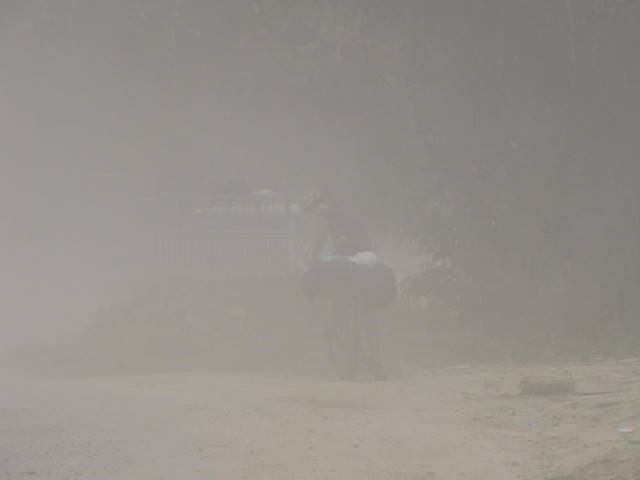 De weg is slecht, erg stoffig maar super gaaf. De afdaling duurt bijna een uur en onze remblokjes hebben het zwaar te verduren. Beneden blijft de weg slecht en bestaat vaak niet uit meer dan los grit. Wat het meest opvalt zijn de vele gaten en de “drempels” van puin. We komen nog langs een fabriek waar stokjes worden gemaakt om mee te eten.