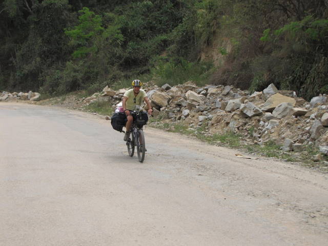 Het blijkt dat de weg vanaf hier verbreed wordt en dat de staat van de weg de komende tijd niet al te best wordt. Na een bezoek aan de primitieve toiletten op de berghelling staan we op het punt om verder te gaan. Dan worden we opgeschrikt door een enorme knal, horen we een enorm geraas en zien een grote stofwolk vanaf de berg komen. Op nog geen 100 van onze rustplaats hebben wegwerkers een stuk berghelling met dynamiet opgeblazen. Als we er langs willen fietsen blijkt de weg verspert te zijn door rotsen. We moeten bijna een uur wachten tot een shovel de boel aan de kant geschoven heeft. We kunnen dan aan de afdaling beginnen.