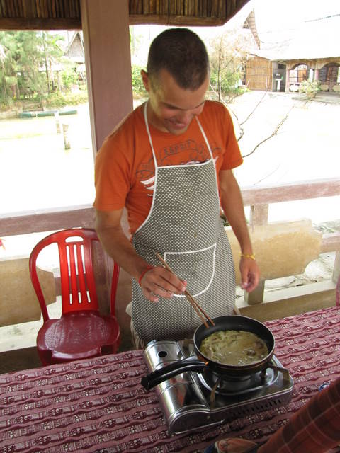 Wij hebben een wat ongeduldige vrouwelijke hulpkok die net even anders ons de ingrediënten aangeeft. Na de bereiding genieten we gelijk van het resultaat. De volgende uitdaging zijn de kokosnootcrêpes met stukjes vlees, garnalen en noten. Uit betrouwbare bron kunnen we vermelden dat ook deze heerlijk zijn. Het volgende maagpleziertje wordt gekruide salade met rijst vermicelli en stukjes varkenshaas. Het laatste gaatje wordt gevuld met de eerder bereide noodle soep.