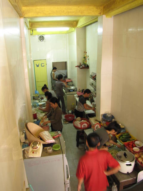 4 april. Vandaag staat de Thaise kookles alsnog op het programma. We worden opgehaald bij het hotel en starten op de markt. Onze kok koopt wat ingrediënten zoals taugé, sla, wortel en komkommer. Wij met onze Engelse gids kunnen hem bijna niet bijhouden zo snel hij er overheen gaat. We maken kennis met Paul en Lin uit San Fransisco. Samen wachten we op de rest van de groep om te starten aan een boottrip richting het eiland waar we gaan koken. Met een twaalftal gaan we op weg. Voor we gaan koken bezoeken we eerst een kleine village. Hiervoor roeien we met een kleine boot langs rijstvelden en waterkokosbomen. Onder het genot van rijstcrackers en water speelt een oude Vietnamees voor ons een stukje op zijn zelfgemaakte viool. Enthousiast proberen we het zelf ook. Het geluid wat geproduceerd wordt is niet veel meer dan een slecht afgestelde zaagmachine. We maken rijstmelk voor de pannenkoeken van straks. Helaas is de kruidentuin leeg, waardoor de uitleg van de gebruikte kruiden ontbreekt. Op hoop van zegen dan maar. We starten onze kookles met de bereiding van verse rijst noodle soep met rundvlees. We doen dit samen met Jason en Monika uit London. De soep moet een uurtje pruttelen dus kunnen wij ons verdiepen in de Vietnamese rolletjes met groente en garnaal aangevuld met noten dipsaus. We werken volgens het principe de kok doet het voor en wij maken het na.