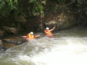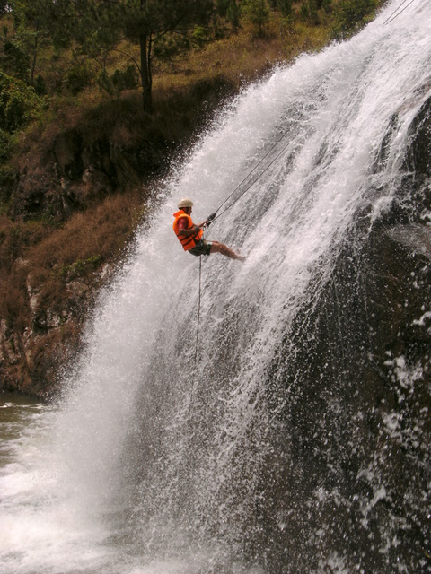 Dan gaan we een waterval abseilen van 25 meter hoog. Het is een heel glibberig geheel en voor een eerste keer best lastig. Het water heeft enorme kracht. Het geeft een enorme kick om aan een touw af te dalen door een waterval, zeker met onze hindernissen. Rhianne had last van een onwillige sandaal die telkens uit wilde glippen en Erwin raakte zijn lenzen bijna kwijt tijdens de afdalingen. Na het intensieve werk is het tijd voor een heerlijke lunch bij de waterval bestaande uit fruit en broodjes. Daarna kunnen we een sprong in het water maken vanaf een zeven meter hoge rots. Dan is het alweer tijd voor de laatste uitdaging, afdalen in een waterval die “de wasmachine” genoemd wordt. De waterval met een breedte van ongeveer een meter heeft een enorme massa aan water. Wanneer we hierin afdalen worden we heerlijk gecentrifugeerd. Moe maar voldaan klimmen we terug naar de autoweg. We hadden erg veel mazzel voor het eerst sinds een week was er zon in Dà Lat en doordat we met z’n tweeën waren konden we meerdere keren abseilen van de watervallen.