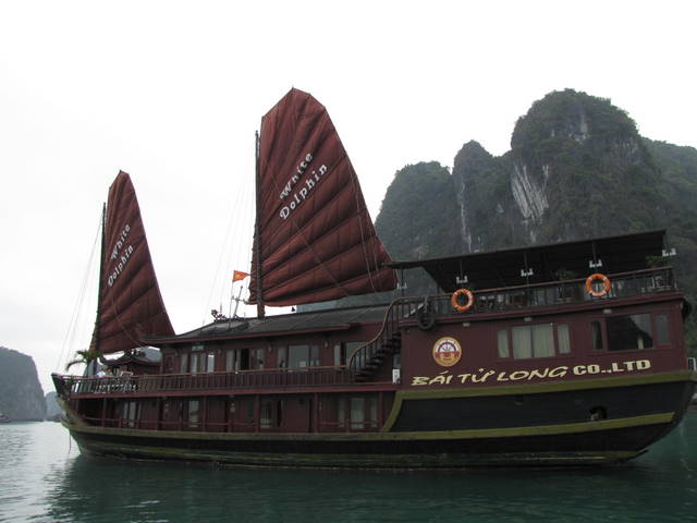 9 april. Om half 8 vertrekken we in de richting van Halong Bay. De bustrip van 160 kilometer, duurt door de slechte weg en drukte in de vele dorpjes lang, bijna vier uur. Onderweg stoppen we nog even voor een pauze en we bezichtigen de fabricage van marmeren beelden. In de haven van Halong Bay ligt onze fantastisch mooie oude boot.