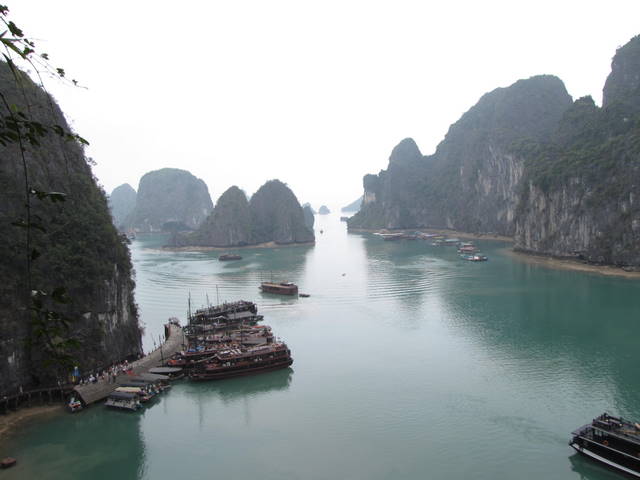 10 april. We hebben om half acht ontbijt aan boord. Wij willen iets van zonsopgang zien dus we beslissen de wekker om zes uur te zetten. Met de nodige moeite lukt het Erwin wakker te worden en naar buiten te gaan. Rhianne draait nog een keer lekker omdat ze het te bewolkt vind om mooie zonsopgang te kunnen zien. Erwin vindt een mooi plekje op een relaxstoel op het achterdek, vanwaar het prachtige ochtendgloren op het water en tussen de bergen wordt aanschouwd. Maar al snel vallen de ogen weer dicht gaan. Pas wakker is hij als een staflid met een stok het terraszeil van water ontdoet. Dit gebeurd nog al amateuristisch waardoor met de stok door het zeil wordt geprikt. Resultaat een nat staflid. Om 7.00 uur maken we ons alsnog klaar voor het ontbijt. Ook dit is van hoge kwaliteit. Na het ontbijt varen we met onze kleine taxiboot naar de dichtbij gelegen grotten. Deze worden niet voor niets ‘amazing caves’ genoemd. De grot bestaat uit drie kamers van verschillende grote. De grotten zijn binnen mooi verlicht. Het heeft een hele grove structuur met vele stalagmieten en stalactieten. Een maal uit de grot genieten van een fantastisch panorama van een berghelling. Voor we het bootje weer opstappen, zien we nog een tweetal aapjes. We aanvaarden de terugvaart naar de haven van Halong Bay. We relaxen nog wat en wisselen adresgegevens uit met Matt en Danae uit Seattle en Jutta en Jochen uit Hannover. Hele gezellige koppels waar we gedurende de trip mee opgetrokken zijn.