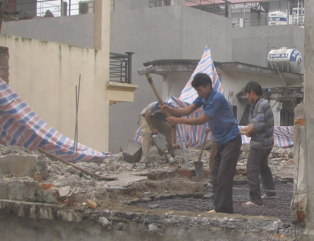 21 april. Opstaan als de werklui beginnen met slopen om 6.45 uur. De tas wordt ingepakt en we nemen nog snel een lekkere douche. Na een vlugge foto nemen we afscheid van Jan en lopen we richting een taxi.