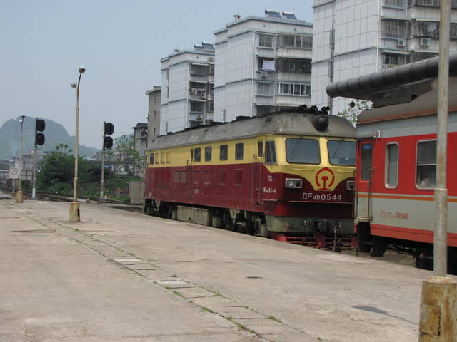 23 april. Vroeg uit de veren, we willen via Guilin naar Yangshou. We moeten om acht uur met de trein mee en willen op tijd op het station zijn. Om 7.15 zijn we op het station en kan het circus beginnen. Om te beginnen moet al onze bagage wederom door een scanner. We krijgen niet echt de indruk, dat er streng gecontroleerd wordt. Dit blijkt ook wel uit de persoonlijke bodyscan. De metaaldetector komt langs als wij zowel backpack als dagrugzak op hebben. Ons kaartje en de borden op het station zijn in het Chinees. Aangezien het voor ons weinig zin heeft dit met elkaar te vergelijken vragen we maar een paar keer waar we heen moeten. Al om half acht kunnen we in een ware golf van mensen richting het perron lopen waar de trein al klaar staat. We verwachten een houten rechte bank, maar het wordt een stoffenuitvoering, wel erg hard.