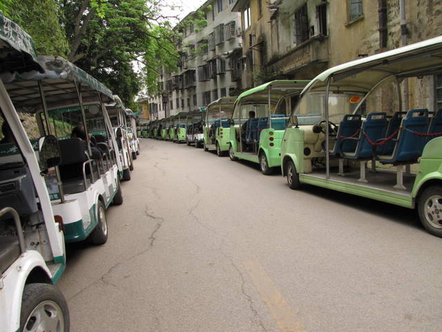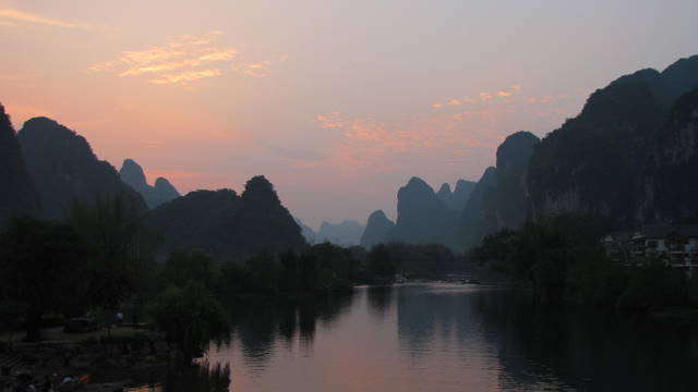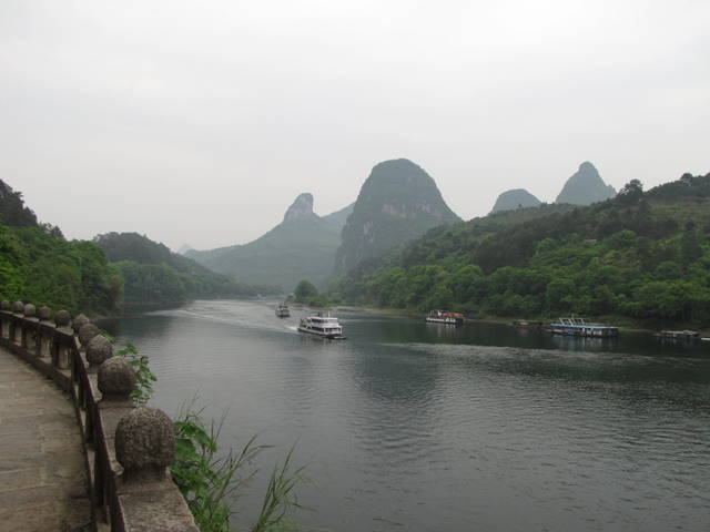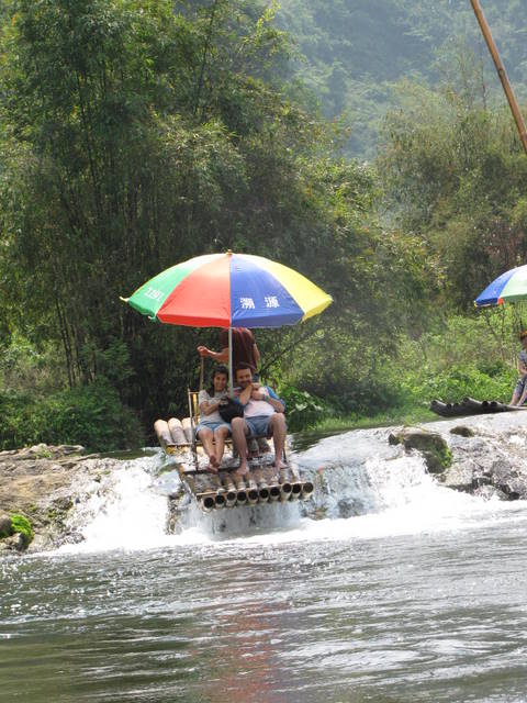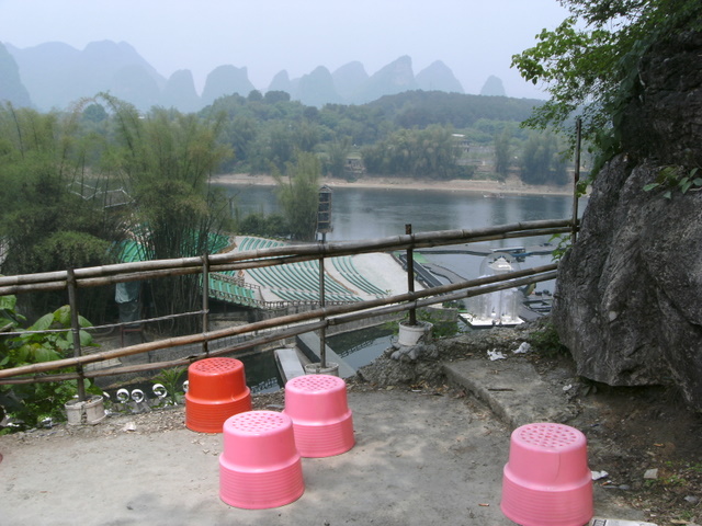 24 april. Door alle extra dekens slaapt het bed toch minder hard dan verwacht. We slapen dan ook lekker uit. In de ochtend doen we weinig. Wanneer Erwin aan het begin van de middag nog een uiltje knapt, gaat Rhianne een stukje lopen richting de Li Rivier. Daar kan op (plastic) bamboeboten gevaren worden en omstebeurt komen Chinezen vragen of ze daar echt geen zin in heeft!? Een stuk verder komen de toeristenboten aan uit Guillin. Massa’s Chinese toeristen komen hier aan om vervolgens in een van de 100 tienpersoons golfkarretjes naar het centrum van de stad gebracht te worden. Hoezo lui!