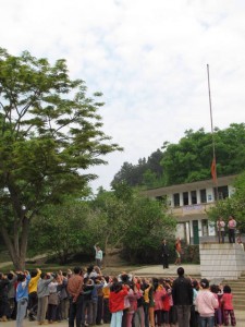 De meubels zijn erg oud en de kinderen zijn veel minder gedisciplineerd als we verwacht hadden. Doordat Simon kan vertalen kunnen we praten met de leraar. Hij vertelt dat de kinderen school niet zo leuk vinden omdat ze moeten. De kinderen krijgen vakken als: Chinees, rekenen, natuur, geschiedenis en muziek. Op latere leeftijd krijgen de kinderen Engels en politiek. Waarin ze de ideeën van Karl Marx te horen krijgen. We volgen een klein stuk van een taalles, met uitleg over de Chinese tekens. Eén puntje anders betekent een heel ander woord. Wat is die taal lastig. Op de vraag hoeveel karakters er zijn wisten ze geen antwoord, maar 2000-3000 was genoeg om jezelf te kunnen redden. Tijdens het pauzekwartier hebben de kinderen openingsceremonie. Iedere klas zich op in rijen op het schoolplein. De vlag wordt gehesen en het volkslied gespeeld.