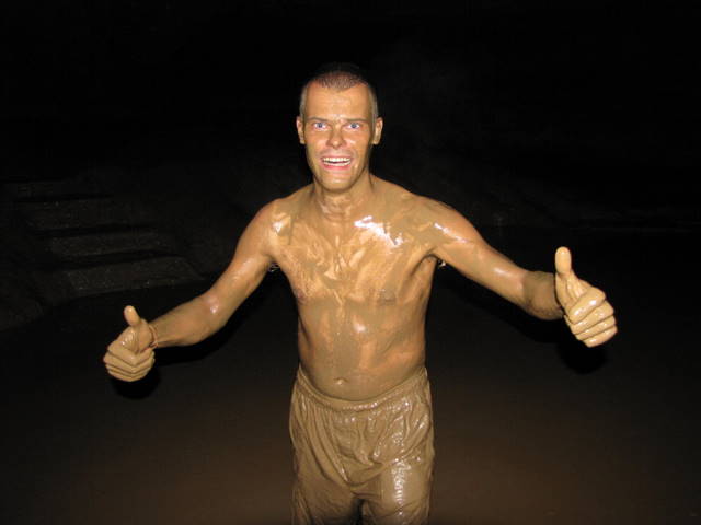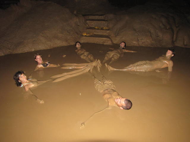 In tegenstelling tot de Li rivier is het hier minder druk en worden er nog echte bamboeboten gebruikt. Een ontspannend tripje met af en toe wat sensatie als we van een verhoging af moeten en we ook wel eens vast komen te zitten. Bij het eindstation zien we aapjes met kleren aan, waar foto’s mee gemaakt worden. Helaas in dit opzicht loopt China nog een beetje achter. We fietsen verder en komen langs de Moonhill. Hier maken we een foto en gaan dan naar de kassa van de watergrot. Met flink onderhandelen komen we uiteindelijk voor 70 yuan binnen (de originele prijs is 240 yuan). Het scheelt toch wel dat wij Simon bij ons hebben. Samen met een Nederlandse familie worden we met een zeer oude en rammelende bus naar de ingang van de grot gebracht. Hier stappen we over op een roeiboot en gaan de koude grot binnen. We moeten oppassen ons hoofd niet te stoten, zo laag is het hier. De grot is erg lang en groot. Er hangen zeer mooie stalagmieten en stalactieten. We gaan zwemmen in een modderbad.