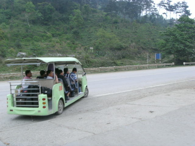 Ja een taxi, want we hebben geen fietsen meer. Een vreemd leeg gevoel geeft dat. De komende tijd zal het best lastig zijn soms zonder fietsen. Maar de voordelen zoals geen problemen meer in de bus en iets sneller door China reizen wogen voor ons zwaarder. Als we bij de bus komen blijkt dat we hier tickets kunnen kopen voor 21 dollar per persoon, in plaats van de 25 dollar die wij betaald hebben bij het toerbureau. Conclusie wil je vanaf Hanoi naar Nanning in China zorg dat je om 7.00 uur of 9.00 uur bij de bus bent op de Tran Quang Khai 204, een veel goedkopere en snellere oplossing dan de trein. De bus is prima, er is genoeg ruimte. Aangezien ons verteld is dat het een toeristenbus is, verwachten we een aantal westerse toeristen maar er gaan alleen Chinese mensen mee. Vooral het laatste stuk naar de grens is mooi want het bestaat uit erg mooi Karstgebergte. Bij de grens een grote poppenkast. We moeten de bus uit en overstappen op een golfkar-achtig-karretje.