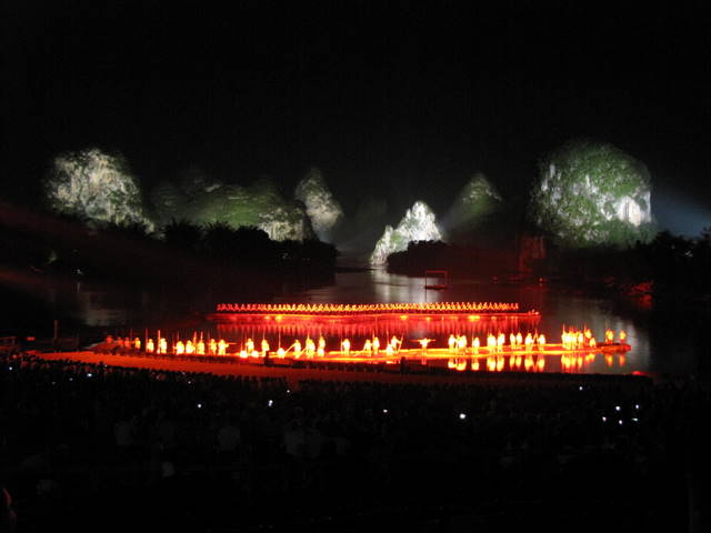 28 april. Voor vandaag weinig op de dagplanning. We verdiepen ons in Hong Kong en Indonesië. In de middag trakteren we ons op een zelfgemaakte fruitsalade met yoghurt en een gebakken eitje uit een straatstalletje. We kijken nog even bij een vuurwerkceremonie (lees het afsteken van een aantal rollen duizendklappers) bij de opening van een winkel. Wat een herrie, maar wel weer een leuk filmpje. Het meest spectaculaire komt uit het avondprogramma als we naar de voorstelling Impression Sanjie Liu gaan. Een openluchtshow op de Li rivier met veel licht, 600 figuranten en gemaakt door dezelfde persoon die ook de opening van de Olympische spelen in Beijing bedacht heeft. We gaan met een klein groepje en voor het eerst mogen we achter een mooi vlaggetje aanlopen van een gids. Er wordt veel gedanst en gezongen.