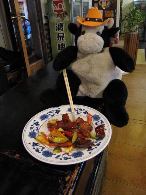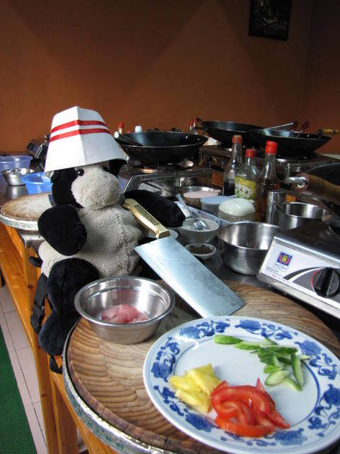 29 april. Het heeft vannacht flink geregend, hierdoor is het buiten flink afgekoeld. Het drupt nog steeds een beetje maar dat maakt voor de volgende missie niet uit. Koen heeft ons namelijk gevraagd of we babi pangang kunnen gaan maken en dan eten, dit is namelijk een opdracht van hem. Van onze kamerverhuurder horen we dat babi pangang hier niet zo genoemd wordt, maar dat het gewoon varkensvlees in zoetzure saus heet. We krijgen een recept en gaan hiermee naar een restaurant wat ook kooklessen geeft. Zij blijken hun eigen babi pangang te maken, dat is natuurlijk ook goed. Samen met nog zeven andere mensen gaan we aan de slag. Behalve de babi pangang maken we ook dumplings en gestoofde aubergine met paprika en chilisaus. We gaan eerst naar de markt, waar ze behalve onze ingrediënten ook vers honden- en kattenvlees verkopen. Als Erwin een foto wil maken van deze situatie wordt hij door een verkoopster bekogeld met stukjes vlees. Zo makkelijk krijgen ze ons niet weg, zie hier onder: