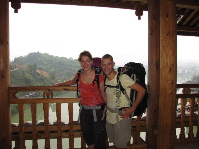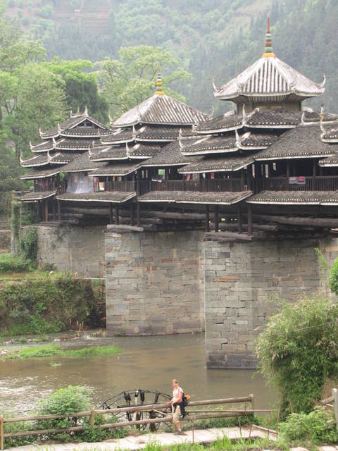 Modern in een oud jasje. We worden getrakteerd op een noodlesoep en Kevin brengt ons ook nog even naar het busstation voor de bus naar Chengyang. Deze busreis duurt een halfuurtje en voert door een prachtige bergachtige omgeving helaas wat nat door het druilerige weer. Dit plaatsje is bekend om zijn 76 meter lange regen- en wind brug uit 1912, zijn prachtige houten gebouwen en etnische volkeren. We vinden een plekje in, de door de Lonely Planet aanbevolen, Yang’s guesthouse en krijgen een houten slaapkamer. Helaas het lijkt erop dat het hotel van eigenaar veranderd is en er wordt geen Engels meer gesproken en geen tripjes aangeboden. Ook de service is flink verlaagd. Aan het eind van de middag is het droog en verkennen we het schilderachtige dorp. Nu is het dorp totaal nog niet toeristisch maar onze verwachting is dat dat binnen enkele jaren helemaal veranderd is. We eten voor het eerst bij een echt Chinees restaurant.