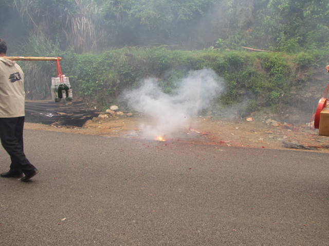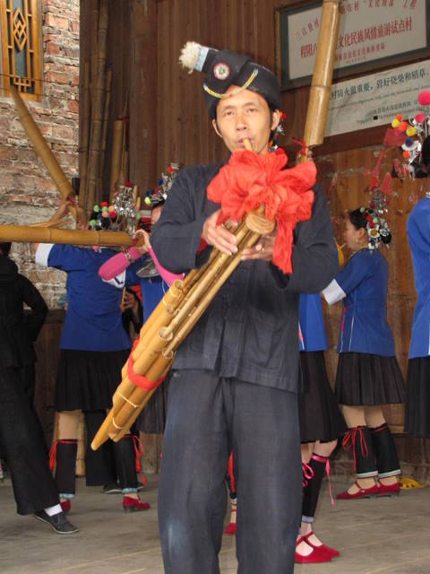 3 mei. Plan is om te gaan wandelen in de omgeving van Sanjiang. Vannacht heeft het flink geonweerd en het weer is instabiel. Tijdens het ontbijt regent het flink. En we bedenken ons net dat dit de eerste dag zal worden die in de regen gaat vallen. Maar dan, alsof de weergoden weten dat we willen wandelen, het wordt droog en dat blijft de hele dag zo. Er liggen verschillende dorpjes dicht in de buurt die met routebordjes staan aangegeven. Een goede kaart ontbreekt. De omgeving is heerlijk ontoeristisch en daar houden we van. In de dichtbij gelegen drumtoren van Ma’an kijken we naar traditionele zang en dans. Op vriendelijk, doch dringend verzoek, betalen we om de kleine wind- en regenbrug over te steken. Het geld wordt gebruikt voor onderhoud aan de brug en onze namen worden vereeuwigd in een steen. In het Yanzhai horen we vuurwerk afgestoken worden, niet geheel ongewoon in China, dus in eerste instantie negeren we het. Pas als meerdere dorpsmensen gaan rennen richting het geluid en ons die kant op wijzen versnellen we de pas. Een stoet van meer dan honderd mensen is op weg naar een huis en hebben allemaal draagmanden met geschenken bij zich. Een aantal manden is voorzien van rollen met duizendklappers en regelmatig worden deze aangestoken.