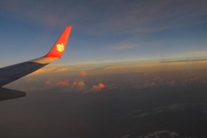 8 juni. Op advies van het boekingskantoor willen we twee uur van te voren op het vliegveld zijn voor onze vlucht naar Jakarta. Aangezien we om 9.00 uur de lucht in gaan betekend dit wel dat we al om 6.00 uur moeten opstaan. Dit valt nog niet mee voor Erwin aangezien hij nog tot laat bezig is geweest met het plaatsen van de post op de website. Voor 15000 Roepia worden we met de tricyclo naar het vliegveld gebracht. De incheck gaat erg snel en we moeten bijna anderhalf uur wachten. Dan maar een reuze beker warme choco met slagroom drinken en een chocolade croissant eten bij de Starbucks. De vlucht verloopt voorspoedig en om half twaalf landen we in Jakarta. Het vliegveld hier is niet erg bijzonder en helaas heeft onze volgende vlucht naar Manado ook nog eens een uur vertraging. Eenmaal in de lucht vergeten we dat snel want de laagstaande zon geeft een wel erg mooi uitzicht over de witte wolken, blauwe hemel en vliegtuigvleugel. We genieten van de fel geeloranje kleuren als de zon daadwerkelijk ondergaat.
