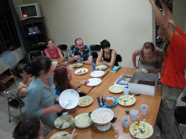 Aan het eind van de middag komt Simon eindelijk even kijken en kunnen we een plan voor morgen maken. Een aantal bouwplannen worden ter plekke gewijzigd en we beslissen om morgen eerst te gaan metselen en dan ’s middags vrij te nemen en naar het dorp in de buurt te gaan. We bestellen nog nieuw cement om zeker te weten dat we genoeg hebben. Na een verfrissende douche gaan we eten in het gastenverblijf en we nemen de laptop mee om nog even te internetten. Na het eten gaat Rhianne met de andere vrijwilligers mee voor een overleg en Erwin werkt de website bij. Als hij in het donker terugloopt naar het vrijwilligershuis, hoort hij in de struiken een hoop geritsel. Hij schijnt zijn hoofdlampje op de struiken en ziet dan een paar groene ogen zijn kant op komen. Dat is duidelijk het moment voor een sprintje richting het huis. Aardig geschrokken vraagt hij wat er allemaal voor beesten in de struiken zitten. Behalve uilen, slangen en wat klein grut eigenlijk niet veel bijzonders. Waarschijnlijk is het één van de katten geweest die in de struik zat. Beetje jammer, zeker als Rhianne beweert dat het misschien zelfs een kitten is geweest. In ieder geval gerustgesteld gaan we lekker slapen.