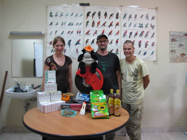 20 juni. Als de zon nog bezig is met zijn dagelijkse opkomst gaat onze wekker. Aangezien de dieren hun ontbijt eerder krijgen als wij (ze staan ook vroeger op), beginnen we de werkzaamheden met slechts een banaan als vulling. Erwin gaat samen met twee andere vrijwilligers de grote vogelvolière schoonmaken en hij voert de aanwezige kakatoes, papegaaien en Victoria duiven (de mooiste duif die we ooit gezien hebben en néé, hij zegt geen roekoe).