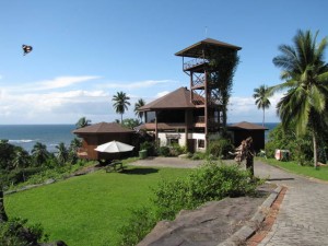 Gelukkig kan het geen kwaad en al snel is het fruit interessanter dan het draadje. We hangen nog even onze gisteren gemaakte speeltjes op bij de papegaaien en gaan dan ontbijten. Na het ontbijt beklimmen we nog een keer de toren bij het gastenverblijf en genieten van het werkelijk fantastische uitzicht over de Molukse zee. Wanneer iemand in de gelegenheid is om Tasikoki te bezoeken, blijf dan zeker een nachtje slapen in één van de gastenverblijven. We kopen nog een Tasikokishirt als aandenken en gaan dan de tassen verder inpakken. Rond half 12 zijn we eindelijk zover en nemen we afscheid van de overige vrijwilligers. Aangezien ook de Indonesische werkers in het huis zijn voor een meeting groeten we ze ook nog een keer. Op weg naar de uitgang lopen we nog even naar de papegaaien om te kijken hoever ze zijn met de speeltjes. De resultaten zijn variërend van volledig gesloopt en leeggegeten tot nog weinig meegedaan. Blijkbaar uitdagend genoeg. Als allerlaatste zeggen we Simon de manager gedag en hij bedankt ons nogmaals uitvoerig. Bij de uitgang hebben we mazzel, de pick-up die voedsel gaat halen moet ook naar Girian en we kunnen meerijden. De poort gaat dicht en we sluiten Tasikoki af met een goed gevoel. Keihard gewerkt en een goed resultaat geboekt ondanks lastige werkomstandigheden. We hebben onze best gedaan!