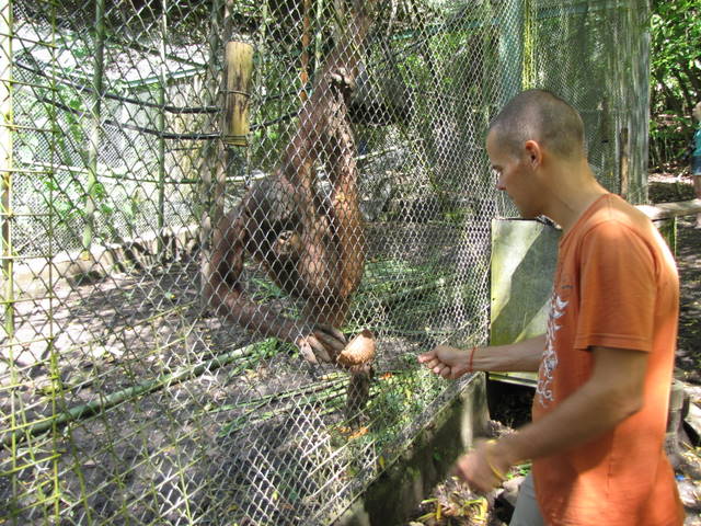 De gastenverblijven en de conferentieruimte zijn erg mooi, helaas hebben ze wat achterstallig onderhoud. Maar er is elektriciteit én internet en dan hebben we ineens een combinatie die we bijna twee weken niet gehad hebben. We checken dan ook even de website en email. We blijken een achternichtje gekregen te hebben en we hebben foto’s gekregen van ons vrijwilligersproject in Cambodja. Deze zullen we, zo snel als mogelijk is in het land met beperkte internetmogelijkheden, op Koen zijn pagina plaatsen. Pas rond halfdrie begint de rondleiding en we zijn best onder de indruk van het project. In Tasikoki worden dieren opgevangen die illegaal gevangen zijn, vaak door smokkelaars. Behalve verschillende aapsoorten, zijn er ook twee krokodillen, een luipaard, verschillende schildpadden, papegaaien en andere vaak endemische diersoorten. Er wordt geprobeerd om de dieren weer uit te zetten in het wild. Aangezien het uitzetten door geldgebrek en de moeilijke procedures heel moeizaam verloopt, is er te weinig ruimte en zijn de hokken vaak veel te klein. Nu wordt geprobeerd door creatief met bestaande materialen om te gaan, hokken om te bouwen tot meer lange termijn verblijven, waar de dieren zich niet hoeven te vervelen. We kijken ontzet bij de twee orang oetangs die in een grote vogelvolière zitten maar zij zijn niet eens het meest schrijnende geval. Dit zijn een aantal apen, die noodgedwongen opgesloten zijn in hokken van nog geen drie vierkante meter. Aangezien er ontzettend veel moet gebeuren en we eigenlijk geen idee waar we het beste kunnen beginnen laten we de beslissing over aan de manager. Zijn idee is om ons een kooi te laten afmaken waar andere vrijwilligers een maand geleden mee begonnen zijn of om de andere te helpen met hun taken. Wij beslissen om niet ingeroosterd te worden en morgen te starten met het helpen van de andere vrijwilligers en ons dan te storten op de nieuwe kooi. Aangezien we om 6.00 uur paraat moeten zijn, gaan we vroeg naar bed.