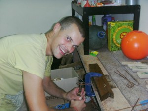 We testen nog even de zaagmachine uit en leren Melki er mee werken. Daarna maken we onze speeltjes voor de vogels af. Als Simon dan een moment tijd heeft dragen we “onze” kooi weer over aan hem. We weten dat er van het weekend een groep vrijwilligers komt die met de kooi verder kunnen, maar dit kan niet zonder hulp van de lassers. Ten slotte demonstreren we Simon nog de nieuwe machine en gaan dan naar het vrijwilligershuis. Hier gooien we onze was in de wasmachine en dat was hard nodig! Onze broeken worden pas na twee keer wassen weer enigszins toonbaar.