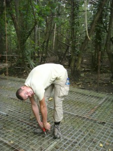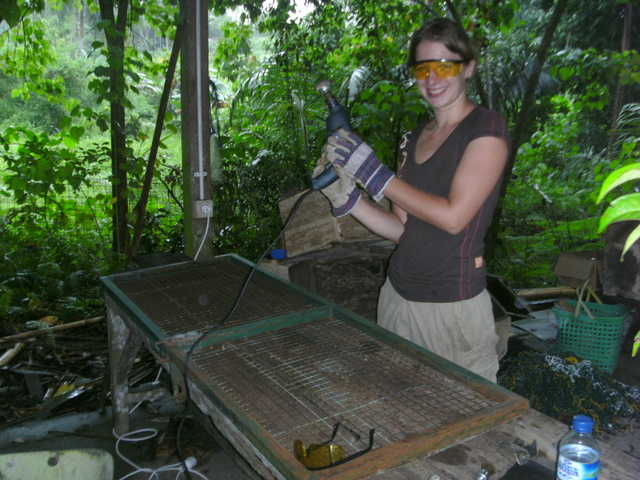 Rhianne gaat mee om de Makaken eten te geven. Haar werk bestaat uit grasplukken en dit op de kooien gooien van de apen. Ook zoekt en zaagt ze bamboe als voorbereiding op het maken van eetbare speeltjes voor de apen. Best lastig nog met een botte zaag. Als we om 8.00 uur eindelijk ons eigen ontbijt achter de kiezen hebben, gaan we vol energie op weg naar de nieuwe apenkooi. Hiervan staat de stenen fundering en vier palen van het frame overeind maar verder is er nog weinig. Er zijn een aantal stukken tweedehands (derdehands is ook goed mogelijk) hekwerk maar dit is niet genoeg en moet nog op maat gemaakt worden. Er blijken nog oude schildpadverblijven te zijn in een overwoekert stuk jungle. De hekken hier zijn geschikt voor onze apenkooi maar moeten nog uitgegraven worden. Dit wordt dus onze eerste klus. Ondanks dat we gewend zijn aan reizen in de hoge luchtvochtigheid en warmte is lichamelijk werk toch wel pittig in deze omstandigheden. We hakken, scheppen en wrikken wat af om de hekken los te krijgen en vooral hekken waar de boomwortels doorheen groeien zijn een uitdaging. We zijn een goed uur bezig, met het nodige resultaat, als de lucht heel snel betrekt en het begint te hozen. We gaan snel naar binnen waar we verder gaan met het maken van de betonankers voor het hekwerk. We onderbreken even voor de middaglunch die er prima in gaat. Helaas blijft het de hele middag gestaag doorregenen en als we alle ankers af hebben en de toekomstige tweedehands deur met een staalborstel onderhanden genomen hebben, zijn de binnen klussen op.