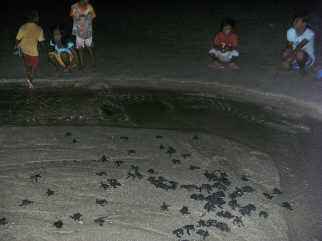 25 juni. Het metselwerk is mooi opgedroogd en ziet er strak uit, vol goede moed doen we ook het laatste stukje. Verder wordt het een dag om te kijken hoever er gewerkt kan worden aan het frame van de kooi. De laatste dagen hadden we veel elektriciteitsuitval en dan gebeurd er weinig. Nu ziet het weer er goed uit maar blijkt ineens dat we geen slijpschijven hebben voor de slijpmachine. Pfff, Melki gaat eropuit om ze te halen. Aangezien het werk aan het frame toch al veel langzamer gaat dan gehoopt, beginnen we vast aan de tunnels, die de nieuwe kooi met de twee oude moeten verbinden en alleen zorgen we voor wat meer marges. Hiervoor hebben we meer netten nodig en we slopen nog wat oude schildpadverblijven. Ook maakt Erwin een start met het uitgraven van een betonnen schildpaddenbad, die kan gaan functioneren als drinkbak voor de beren. Als het begint te regenen houden we het voorgezien. We houden een extra uurtje slaap aangezien we een lange nacht voor de boeg hebben. We gaan namelijk wachtlopen op het strand bij een schildpadden rescuecentrum. Net als Tasikoki is ook dit een project uit de stichting van Willie Smit. We gaan met twee auto’s en een afgehuurde mikrolet op pad. De trip duurt ruim een uur en gaat over een grotendeels slechte kronkelweg. Bij aankomst geeft Simon ons een korte introductie over het centrum en verteld dat dorpsbewoners als rangers optreden en de eieren rapen van de schildpadden voordat stropers dit kunnen doen. Ze laten de eieren uitkomen en begeleiden de kleine schildpadjes naar de zee. Op dit strand komen vijf van de zeven zeeschildpadsoorten ter wereld voor. Vanavond worden 200 schildpadjes uitgezet en wij wijzen ze met onze zaklampen de weg naar zee.