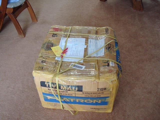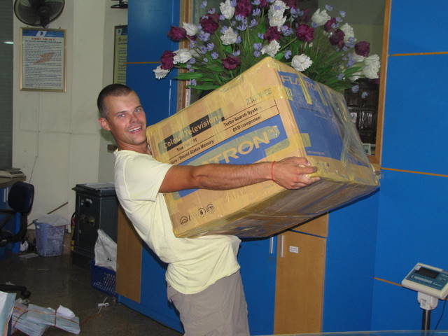 We zijn begin april in Ho Chi Min (Vietnam) als we horen dat er een pakketje uit Zuid-Afrika en Thailand is gebracht bij onze zaakwaarnemer (de moeder van Erwin). Wij beslissen dat deze opengemaakt mogen worden in bijzijn van de ouders van Rhianne zodat we maar één keer hoeven uit te leggen wat de inhoud is. Een speciale afspraak wordt gemaakt en vol verwachting gaan de ouders uitpakken. Behalve twee setjes kleren voor onze neefjes, een lampfitting voor Erwin zijn vader en wat kerstdecoratie voor Rhianne haar moeder is de volledige inhoud voor ons zelf. Uiteraard krijgen we dat te horen. We beloven de volgende keer wat souvenirtjes mee te sturen. We informeren bij het postkantoor naar de prijzen voor het verzenden van een pakket uit Vietnam. In vergelijking met Afrika en Thailand valt het reuze mee. We horen dat de maximale maten 1x1x1 meter mogen zijn en het idee is geboren om een zo groot mogelijk pakket op te sturen naar huis. Aangezien we ook nog de fietsen hebben kunnen we makkelijker souvenirtjes vervoeren. Vol goede moet begint in Da Lat en Hoi An de verzameling en al snel hebben we een grote roze tas achterop met spulletjes, die we kilometers meeslepen. In Hanoi vragen we voor de zekerheid nog even de prijzen op. Bij het internationale postkantoor zijn de prijzen en maten gelijk aan Ho Chi Min en bij het 10 meter verderop gelegen normale postkantoor zijn de prijzen hoger, makkelijke keuze dus. In Hanoi en Sa Pa begint het verzamelen pas echt. We hebben zoveel spullen dat we een fikse doos kunnen vullen, alleen waar haal je die vandaan zonder een woord Vietnamees te spreken. Uiteindelijk vinden we de oplossing bij een oud karton inzamelaar. Voor 1 dollar kopen we een grote televisiedoos, die we achterop de fiets door Hanoi vervoeren. Helaas blijken grote lichte cadeaus moeilijk te vinden dus moeten we de doos iets kleiner maken.