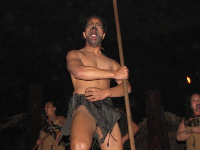 We komen aan in Rotorua en gaan als eerste naar het toeristenbureau. Ze hebben tientallen kortingsacties voor activiteiten, vooral combinatietickets en wij maken uiteraard graag gebruik van deze kortingen! We reserveren voor vanavond een Maori en Kiwi experience en een plekje in het plaatselijke jeugdhostel. Hier rijden we gelijk heen, checken in en krijgen de tijd om een halfuurtje een powernapje te doen. Het was toch wel een kort nachtje. We worden even voor zessen met een busje opgehaald voor het avondprogramma en naar het Mitai Maori Village gebracht. De Maori, dit zijn traditionele inwoners van Nieuw Zeeland geven elke avond een diner +’optreden’ om iets van hun cultuur te laten zien. Nieuw Zeeland heeft 71 stammen op het Noordereiland en 6 op het zuidereiland. Graag snuiven wij wat op van deze traditie en schuiven aan in de grote tent. De vader van de stam zingt mee met een Maori cd en zorgt voor een gezellige noot. De tent vult snel en terwijl wij denken met twintig mensen te gaan worden het er meer dan vijftig. We worden welkom geheten door onze Maori gastheer en hij spreekt meer dan zestig talen en kan de groep die bestaat uit zestien verschillende nationaliteiten in eigen taal welkom heten. Dan moet er een chief (leider) gekozen worden in de groep. Hij zal vragen aan de chief van de Maori of we in hun dorp mogen komen. Na wat aarzeling biedt een Engelsman zich aan als dappere chief. We gaan naar buiten en zien daar hoe ons eten bereid wordt op de ondergrondse barbecue. We verplaatsen ons naar de rivier waar de bewoners met een kano en fakkels een spectaculaire binnenkomst hebben. Op het podium van het dorp vindt de openingsceremonie plaats en worden met veel entertainment spellen, muziekinstrumenten en vechttechnieken van de Maori geshowd. De mensen hebben hele typische gezichtsuitdrukkingen. Ze zetten grote ogen op en steken de tong wel erg ver uit de mond. Soms lijkt het er zelfs op dat ze zichtzelf niet serieus nemen en maken flink wat grappen met hun gebruiken. Het hangt tussen serieus en commercieel/toeristisch in.