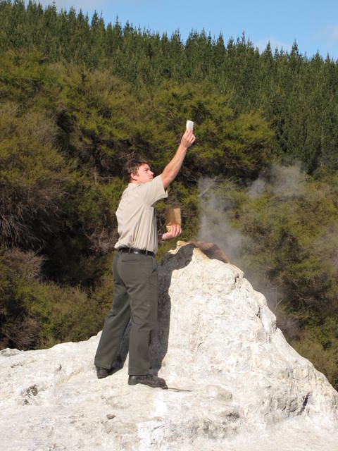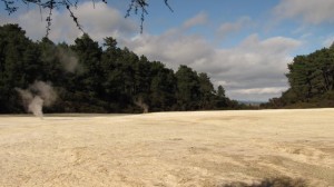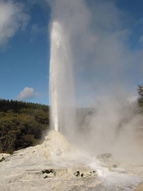 18 augustus Vroeg in de ochtend rijden we vanuit Rotorua naar het dertig kilometer verderop gelegen Wai-O-Tapu (Heilige Waters). Dit is Nieuw Zeelands meest kleurrijke en veelzijdige thermisch actieve gebied. Al op onze weg er naar toe zien we meerdere stoomwolken boven het landschap uitstijgen, een teken van een hotspring. Aangezien we vroeg in het park zijn en het vannacht erg koud geweest is, zijn er grote stoomwolken te zien. In combinatie met de stralende zon zorgt dit voor erg mooie plaatjes. Het gebied is achttien vierkante kilometer groot maar slechts een klein deel is open voor publiek. Maar wat voor een deel. Zulke mooie en vooral kleurrijke landschappen, zo dicht bij elkaar, hebben we nog nooit gezien en ze zijn ook erg moeilijk te beschrijven. We zien verschillende kraters, poelen, water in verschillende kleuren, spuitend modder en geisers. De mooiste en meest actieve geiser is de Lady Knox Geiser. Iedere dag om kwart over tien in de morgen geeft deze geiser een eruptie. Dit is mogelijk doordat er natuurvriendelijke chemicaliën in de geiser gegooid worden.