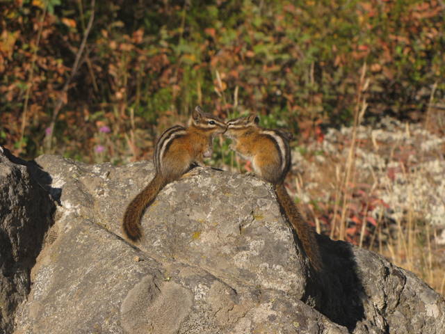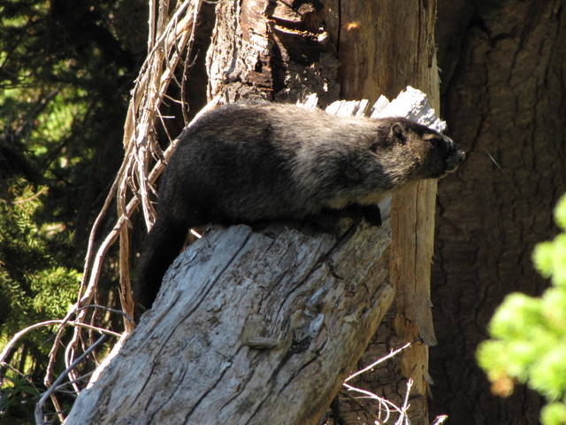 07 september. Vroeg in de ochtend komt het belangrijkste nadeel van onze puntzaktent om de hoek kijken. Onze slaapzakken zijn wat nat geworden doordat het landbouwzeil niet ademend is en de tent van binnen vochtig geworden is. Dit komt vooral doordat het buiten de tent is afgekoeld tot slechts vier graden en deze temperaturen hebben we voor het laatst in Nieuw Zeeland gevoeld. We ruimen snel de boel in de auto en ontbijten pas voor we gaan wandelen vlakbij de camping. Hier schijnt de zon en is het aangenamer te noemen. De bevertrail die we voor ogen hebben duurt slechts tien minuten en behalve een beverfort is er weinig bijzonders te zien. We willen in het visitorcentrum om betere trails vragen maar helaas, het centrum is nog dicht ondanks dat het al een uur open hoort te zijn. Met een omweg komen we uiteindelijk uit bij de trails rond het Lighting Lake. We wandelen ruim twee uur rond het blauwe meer, met rondom bergen met vooral veel dennenbomen en witte sneeuwtoppen. Ondertussen dat wij zoeken naar de juiste paden, aangezien bordjes dun gezaaid zijn, zien we erg veel eekhoorns nootjes eten. (Sorry, dit is letterlijk overgenomen van de eerder gemaakte aantekeningen).