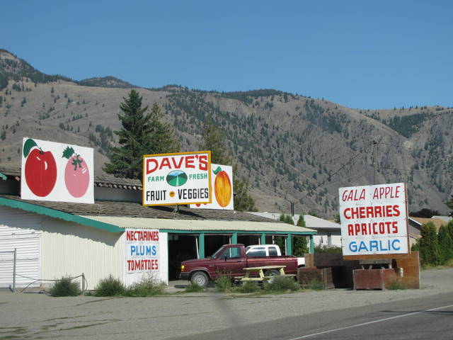De eerste grotere plaats is Princeton hier worden vandaag de dagelijkse boodschappen gedaan in een super supermarkt. Toch lastig elke dag een andere supermarkt en vooral als ze dan net zo groot zijn als een warenhuis. Rhianne heeft net zoveel tijd nodig om de boodschappen te vinden als Erwin nodig heeft om zijn kapsel tot normale (lees korte) lengte terug te laten brengen. De temperatuur loopt inmiddels op tot boven de dertig graden en het verschil met de morgen is erg groot. Eenmaal achter Princeton lijkt het net of de herfst is ingevallen. Het landschap verandert snel van bergen met groene bomen en sneeuw naar droge gele bergen met bruine bomen, gras en veel rosten. Door de bevloeiing is het contrast met de bloeiende en groene valleien tussen de bergen in erg groot. Het Zuidelijke Okanagan gebied wat we nu ingaan is Canada’s beste en grootste tuinbouwgedeelte. Vele tientallen soorten groente en fruit worden hier in grote mate verbouwd. Dit is goed te zien in het dorp Keremeos.