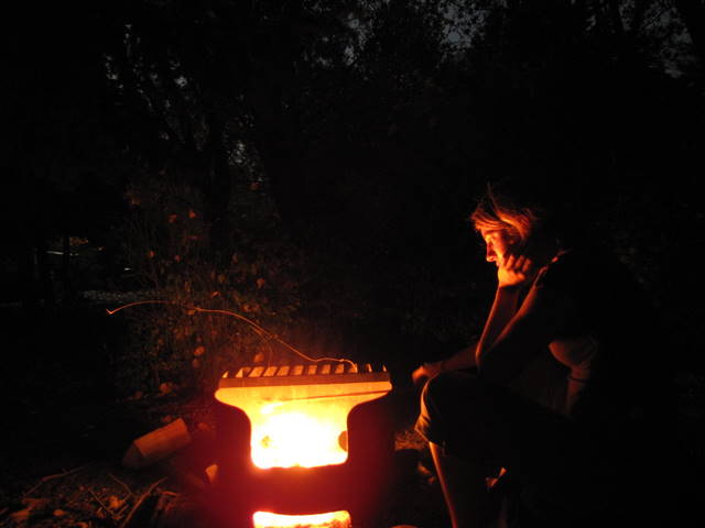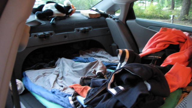 Na het eten regent het nog niet maar we hebben geen zin meer om onze frietzaktent op te zetten. Wat we wel doen is het, in het pikkedonker, verplaatsen van onze rijdende hotelkamer dichterbij het toiletgebouw. We poetsen de tanden en staan op het punt om te gaan slapen. Twee vakantiegangers met een camper kijken ons zo vreemd aan dat we even gaan kijken bij ze. Het blijkt ook een Nederlands koppel te zijn, die zich afvroegen of wij gaan slapen in de auto. Ja dus. Onder het genot van een biertje en dichtbij hun vuurtje geven we de tekst en uitleg over onze reis en dus ook de creatieve manier van boekhouden. Pas laat in de avond gaan we alsnog naar onze matjes en het regent nog steeds niet. Aantal gereden kilometers vandaag 126 km